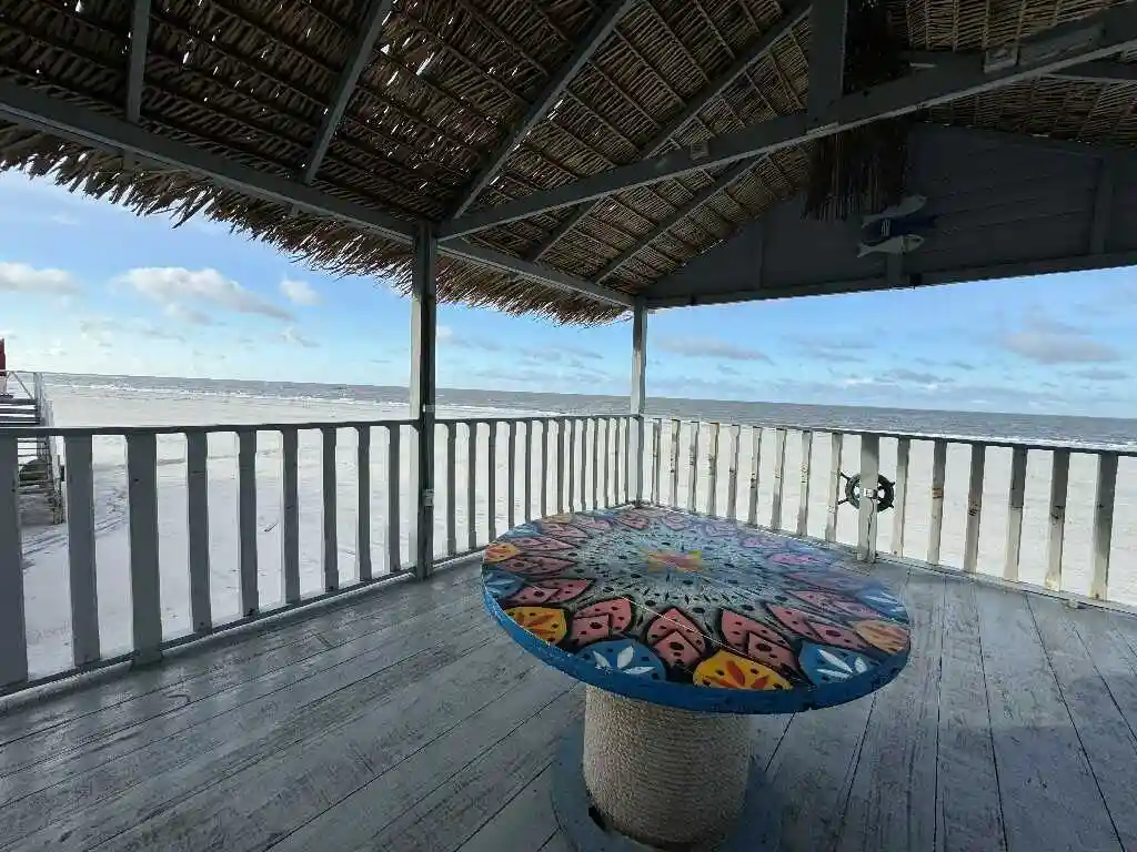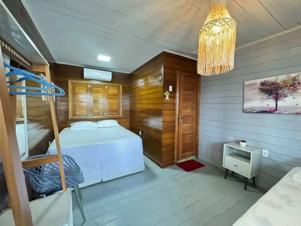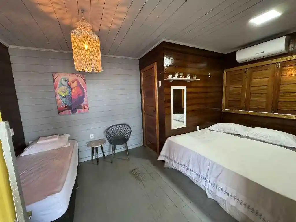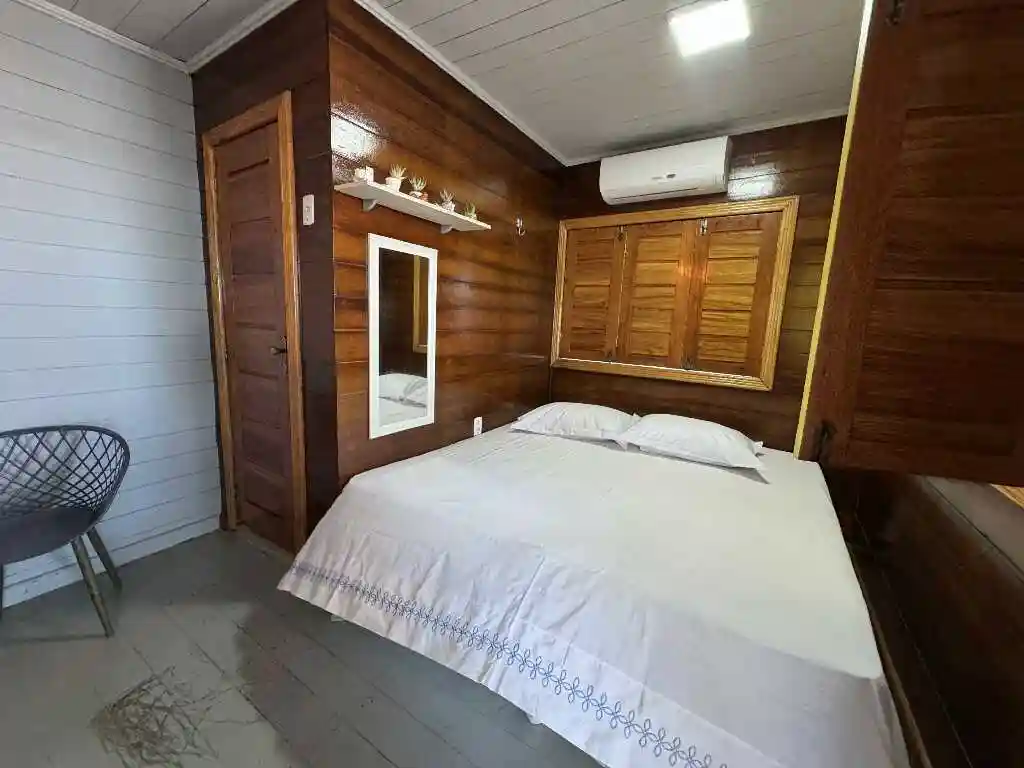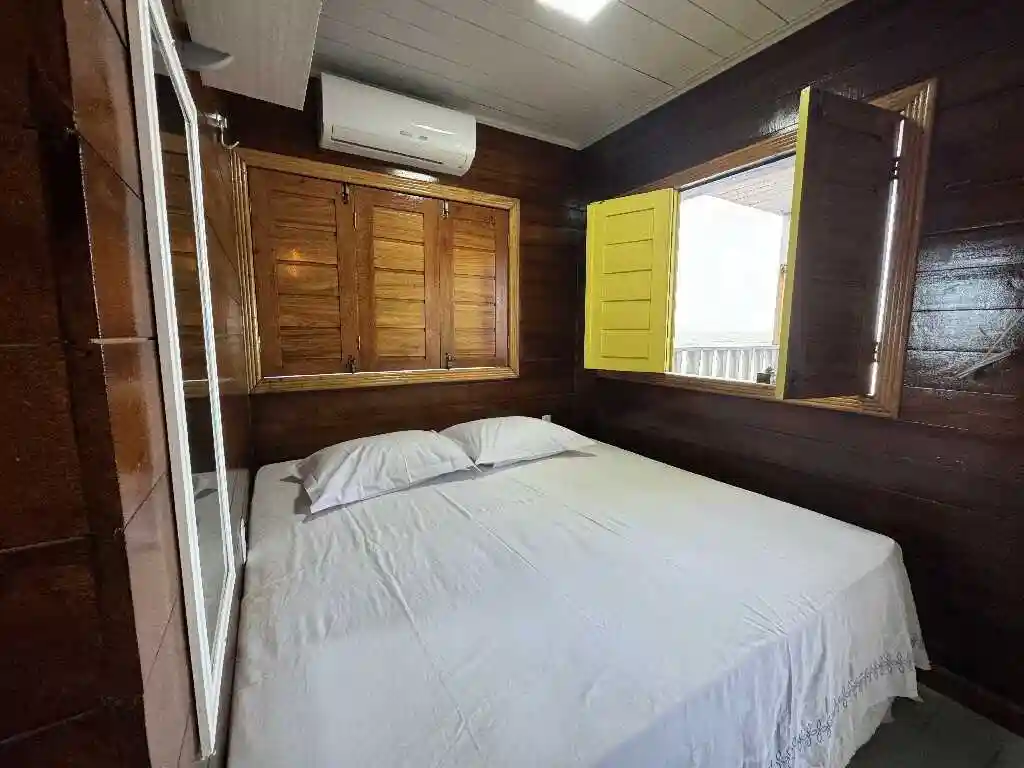 A sala de estar espaçosa, a mesa de refeições e a cozinha compacta oferecem tudo que você precisa para uma estadia prática e acolhedora. A varanda ampla com vista para o mar é um convite ao lazer e contemplação. O ambiente conta com ar-condicionado para maior conforto, mantendo a simplicidade natural do litoral — sem chuveiro elétrico, mas com toda a essência de Ajuruteua.