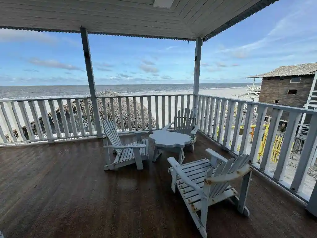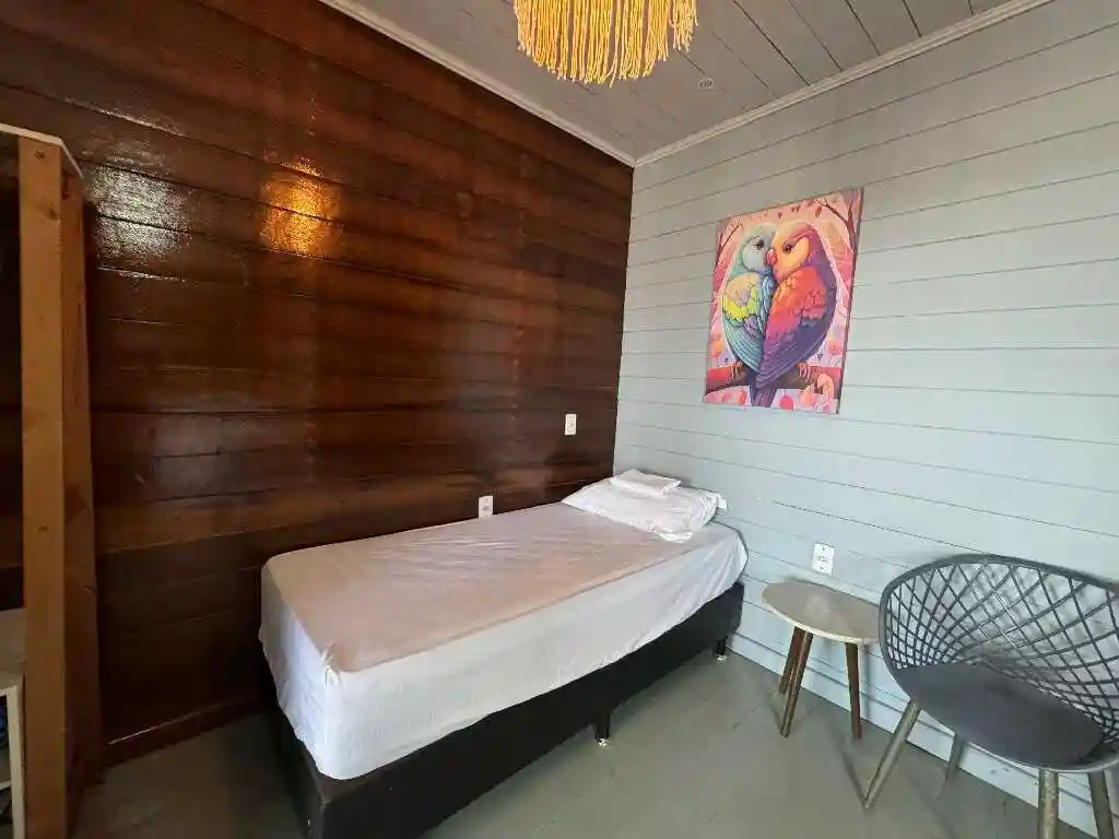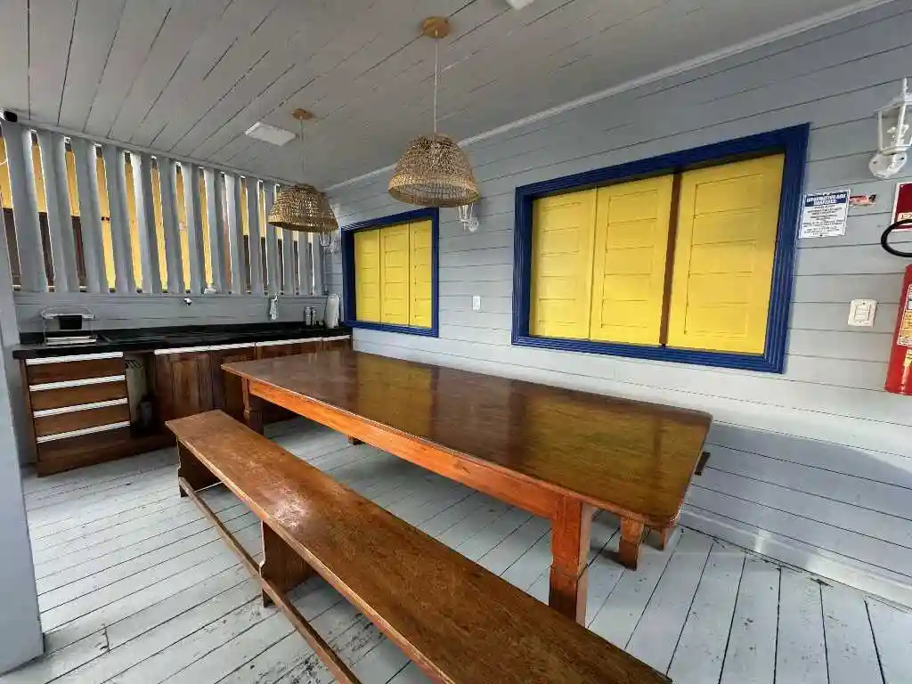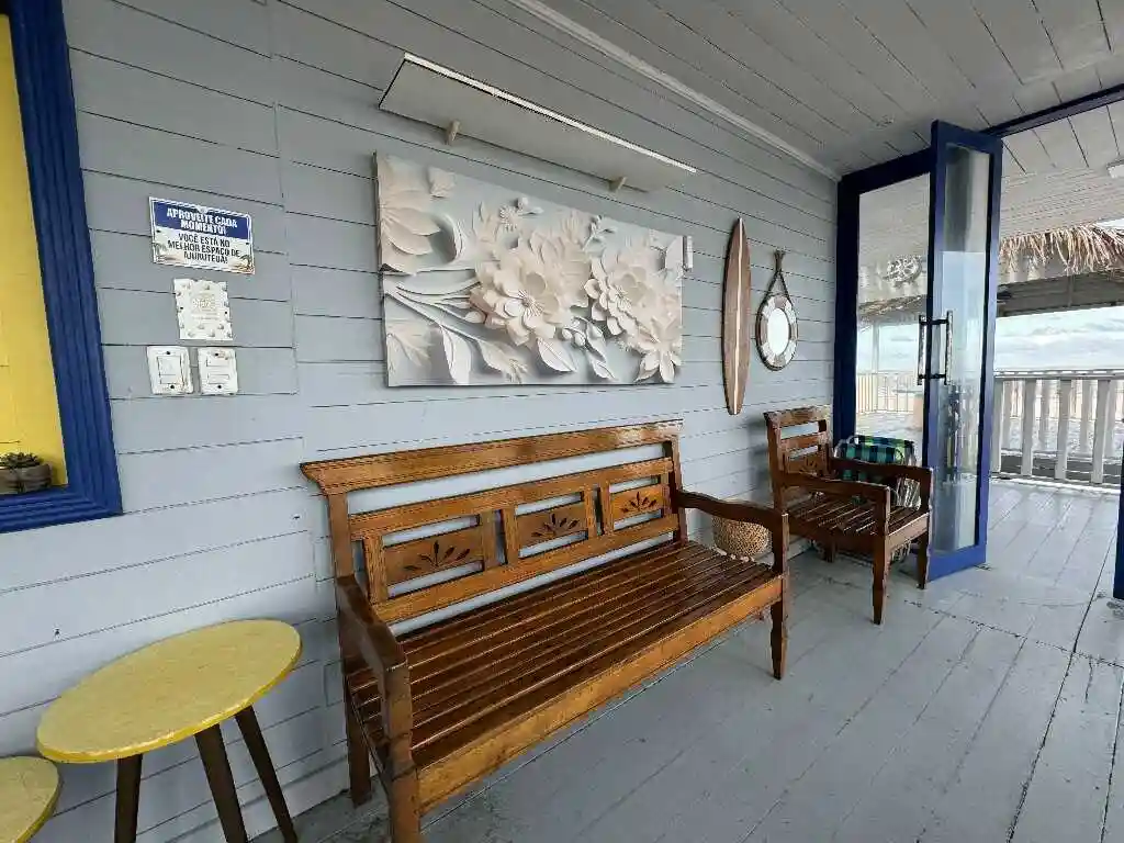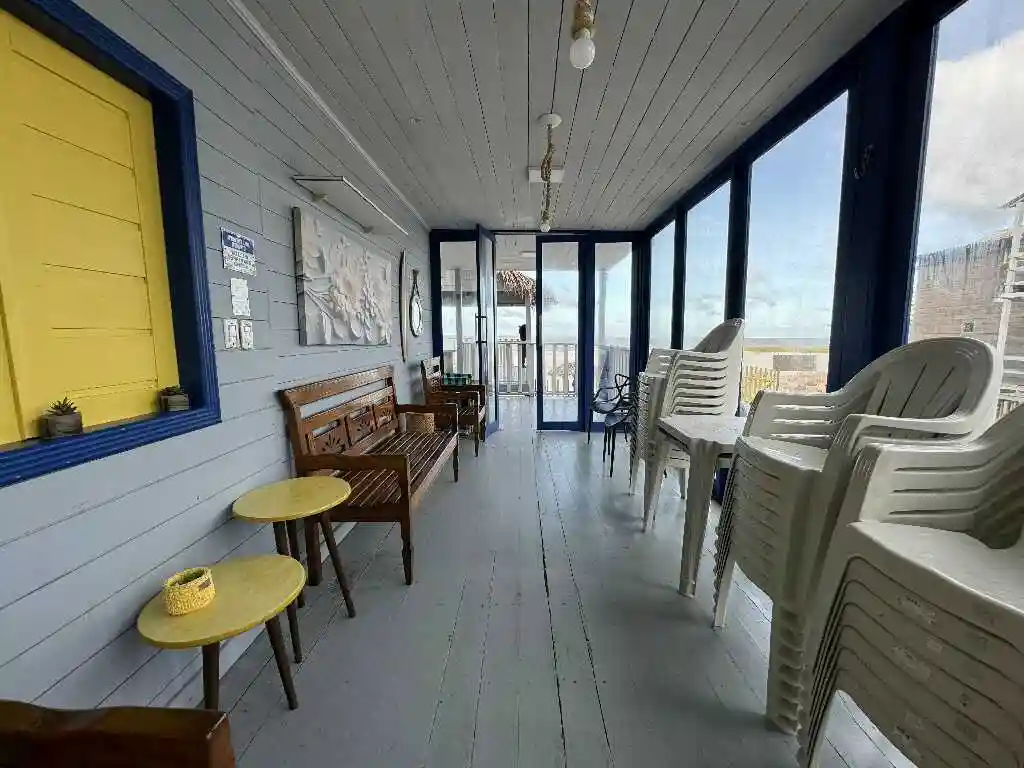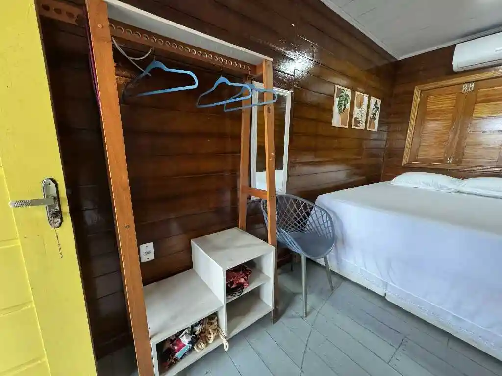 A sala de estar espaçosa, a mesa de refeições e a cozinha compacta oferecem tudo que você precisa para uma estadia prática e acolhedora. A varanda ampla com vista para o mar é um convite ao lazer e contemplação. O ambiente conta com ar-condicionado para maior conforto, mantendo a simplicidade natural do litoral — sem chuveiro elétrico, mas com toda a essência de Ajuruteua.